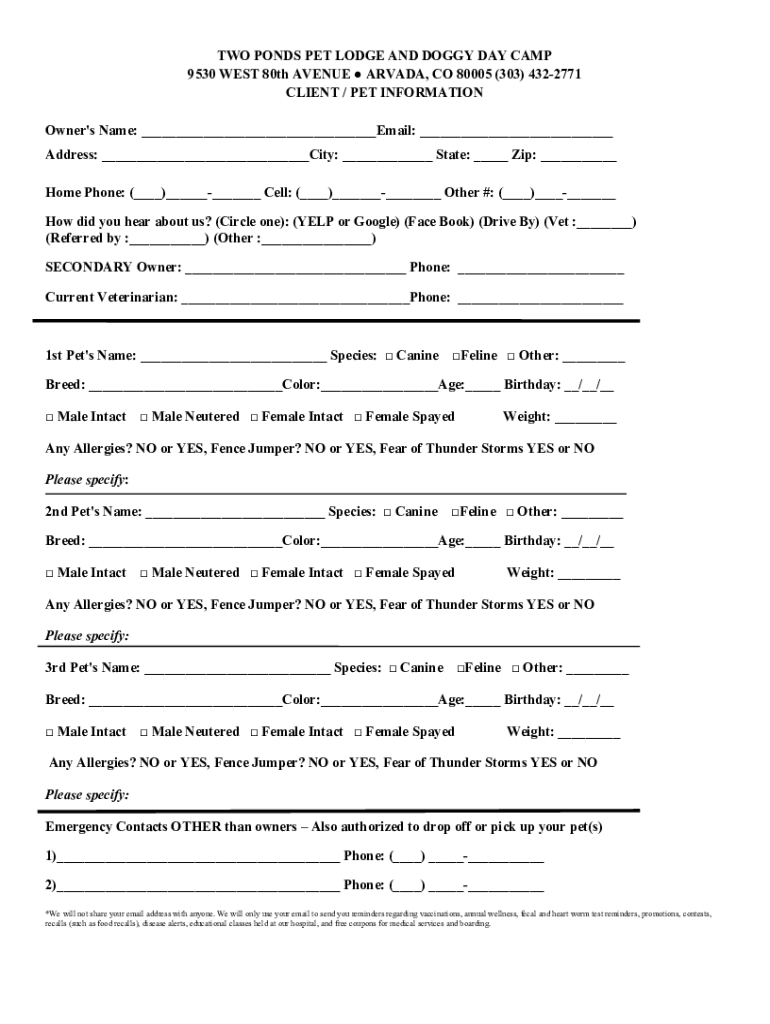 TWO PONDS PET LODGE AND Dog DAY CAMP 9530 WEST 80th AVENUE ARVADA, CO 80005 (303) 4322771 CLIENT / PET INFORMATION Owner\'s Name: ___Email: ___ Address: ___City: ___ State: ___ Zip: ___ Home Phone: