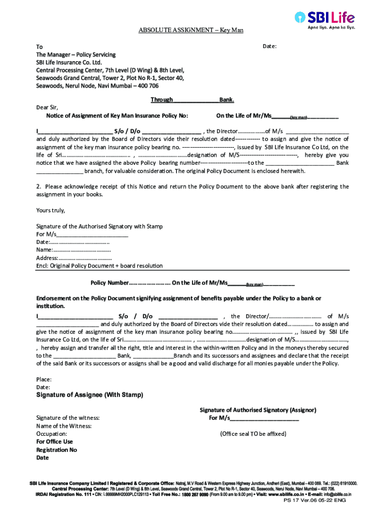 ABSOLUTE ASSIGNMENT Key Man Date:Through ___ Bank. Dear Sir, Notice of Assignment of Key Man Insurance Policy No: On the Life of Mr/Ms___(key man)___ I___ S/o / D/o ___, the Director. Of M/s ___ and
