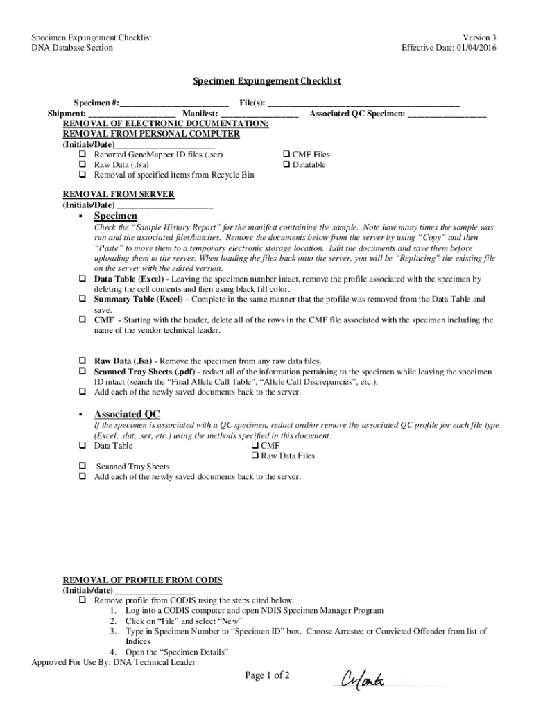 Version 3 Effective Date: 01/04/2016Specimen Expungement Checklist DNA Database SectionSpecimen Expungement Checklist Specimen #:___ File(s): ___ Shipment: ___ Manifest: ___ Associated QC Specimen: