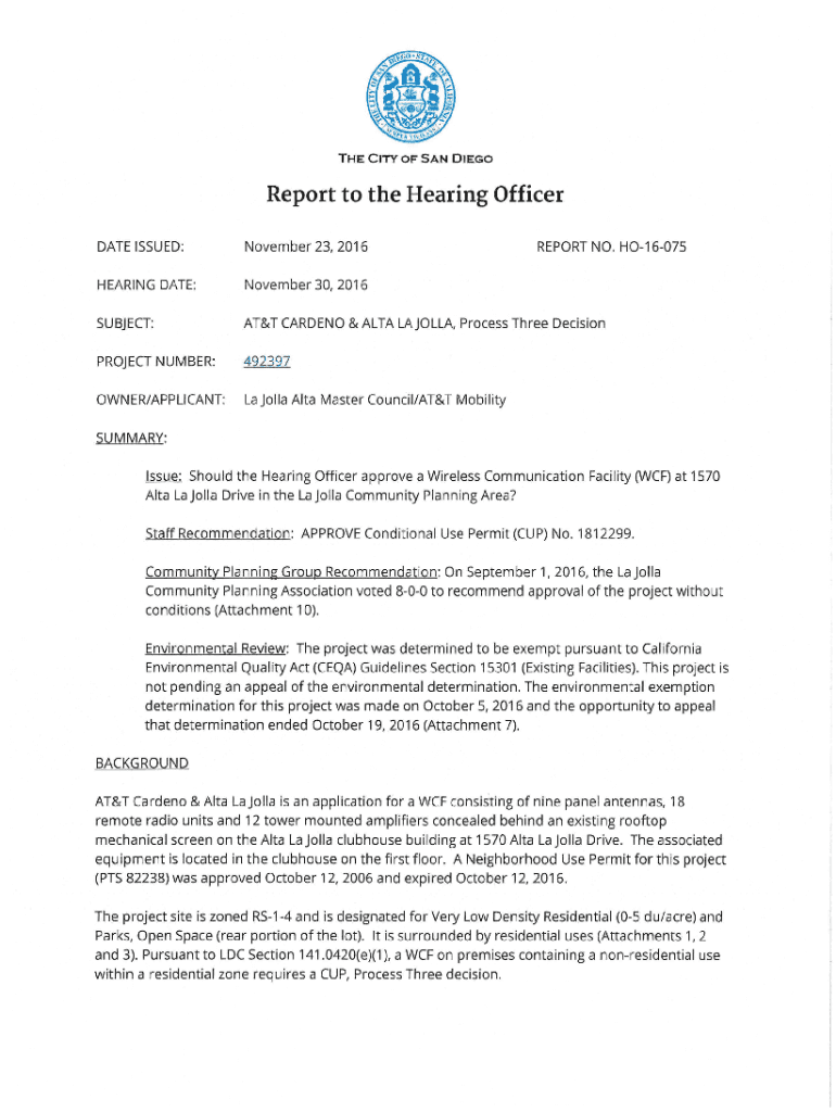 THE CITY OF SAN DIEGOReport to the Hearing Officer DATE ISSUED:November 23, 20 16HEARIN G DATE :November 30, 20 16SUBJECT:AT&T CARD END & ALTA LA JOLLA, Process The free DecisionPROJECT NUMBER:492397OWNER/APPLICANT:La