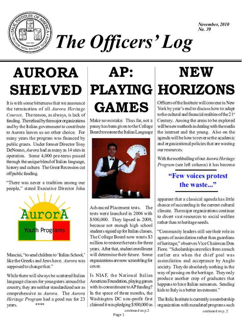 The Officers Log November 2010 No. 39AP: NEW AURORA SHELVED PLAYING HORIZONS Gamest is with some bitterness that we announce the termination of all Aurora Heritage Courses. The reason, as always,