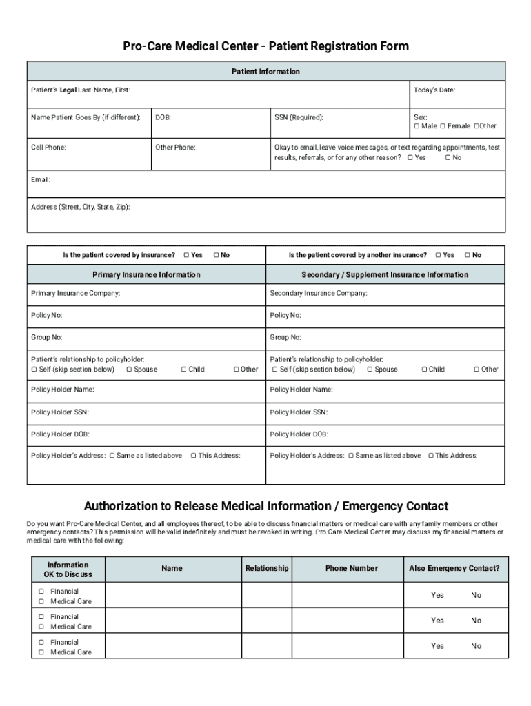 Procure Medical Center Patient Registration Form Patient Information Patients Legal Last Name, First:Today's Date:Name Patient Goes By (if different):DOB:SSN (Required):Cell Phone:Other Phone:Okay
