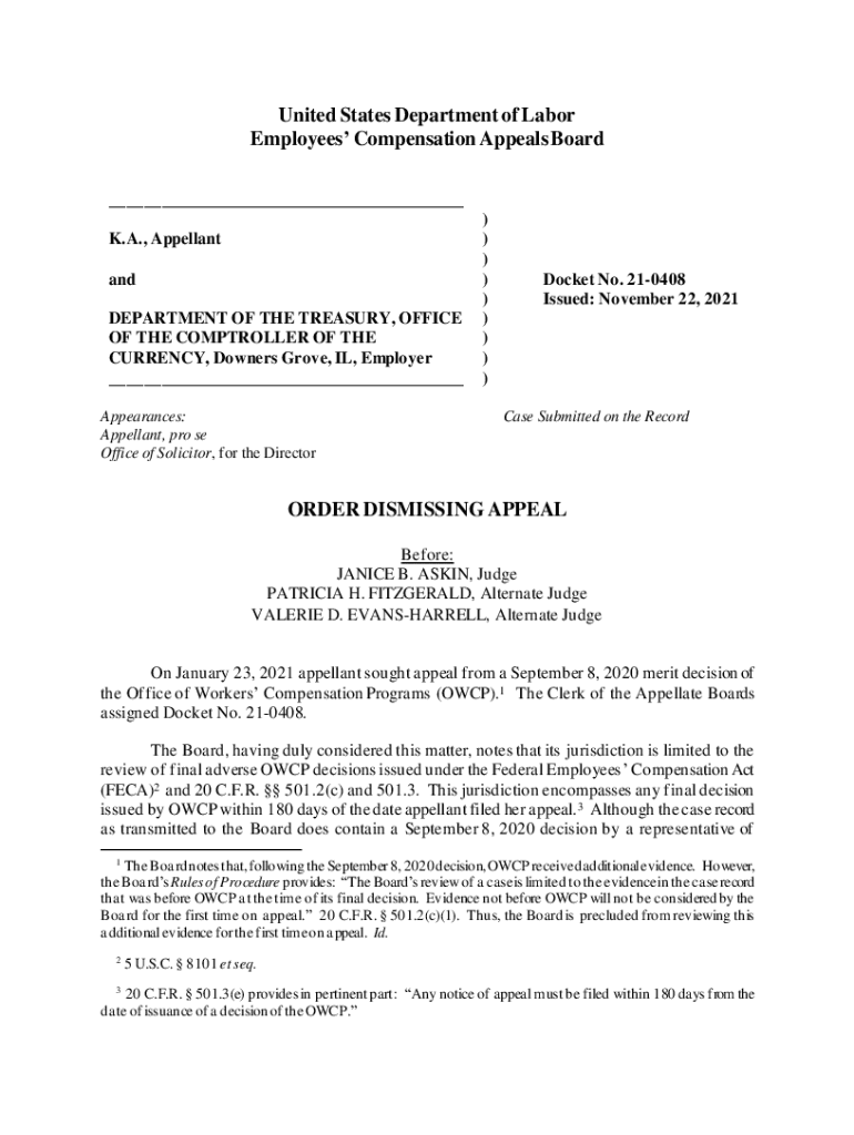 United States Department of Labor Employees Compensation Appeals Board ___ K.A., Appellant and DEPARTMENT OF THE TREASURY, OFFICE OF THE COMPTROLLER OF THE CURRENCY, Downers Grove, IL, Employer ___