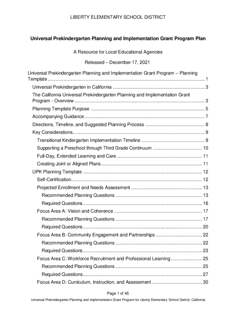 LIBERTY ELEMENTARY SCHOOL DISTRICTUniversal Prekindergarten Planning and Implementation Grant Program Plan A Resource for Local Educational Agencies Released December 17, 2021, Universal Prekindergarten