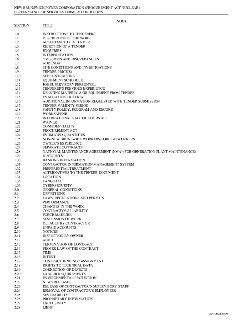 NEW BRUNSWICK POWER CORPORATION (PROCUREMENT ACT NUCLEAR) PERFORMANCE OF SERVICES TERMS & CONDITIONS INDEX SECTIONTITLE1.0 1.1 1.2 1.3 1.4 1.5 1.6 1.7 1.8 1.9 1.10 1.11 1.12 1.13 1.14 1.15 1.16 1.17