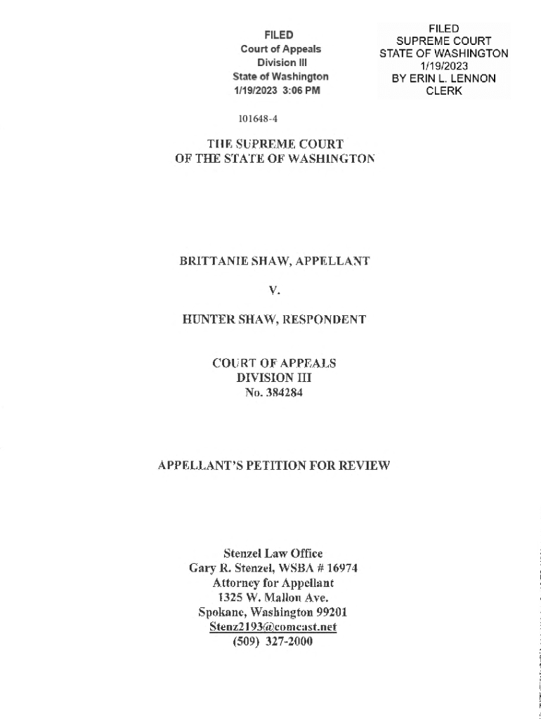 FI LED Court of Appeals Division Ill State of Washington 1/19/2023 3:06 PM1016484THE SUPREME COURT OF THE STATE OF WASHINGTONBRITTANIE SHAW, Appellant. HUNTERS, RESPONDENTCOURT OF APPEALS DIVISION