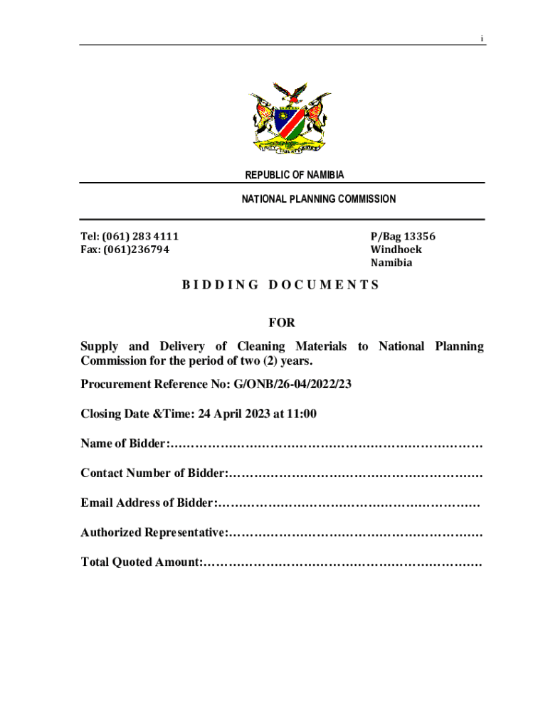 REPUBLIC OF NAMIBIA NATIONAL PLANNING COMMISSION Tel: (061) 283 4111 Fax: (061)236794P/Bag 13356 Windhoek NamibiaBIDDING DOCUMENTS FOR Supply and Delivery of Cleaning Materials to National Planning