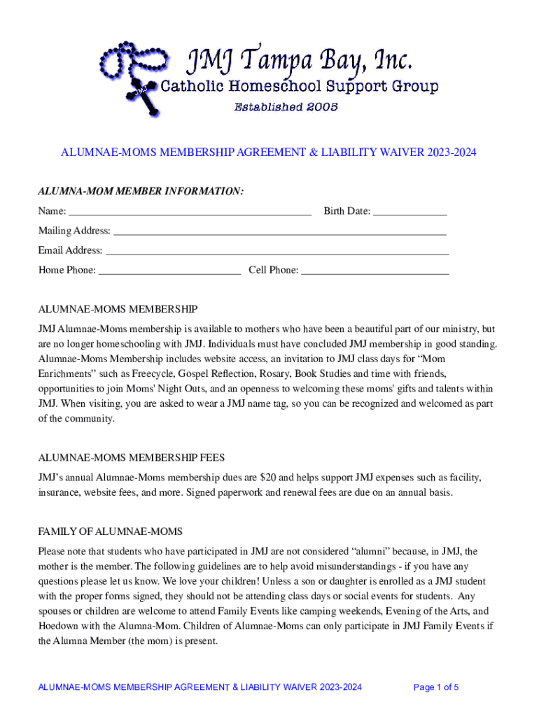 ALUMNAEMOMS MEMBERSHIP AGREEMENT & LIABILITY WAIVER 20232024 ALUMNA MOM MEMBER INFORMATION: Name: ___Birth Date: ___Mailing Address: ___ Email Address: ___ Home Phone: ___ Cell Phone: ___ALUMNAEMOMS