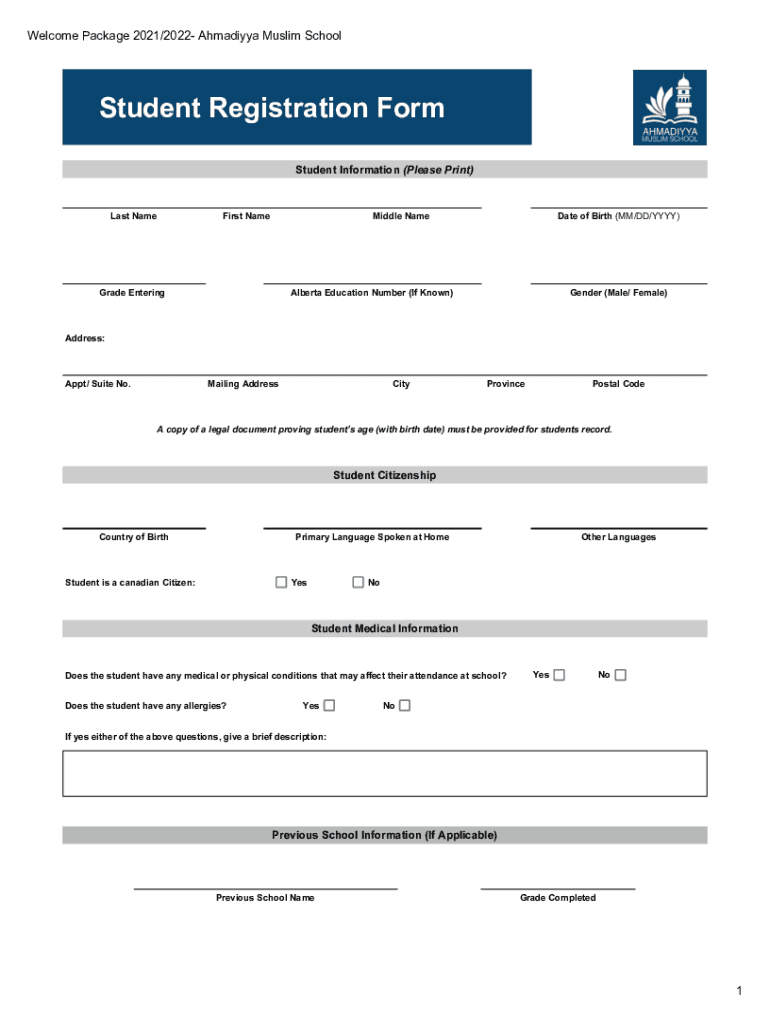 Welcome Package 2021/2022 Ahmadi Muslim SchoolStudent Registration Form