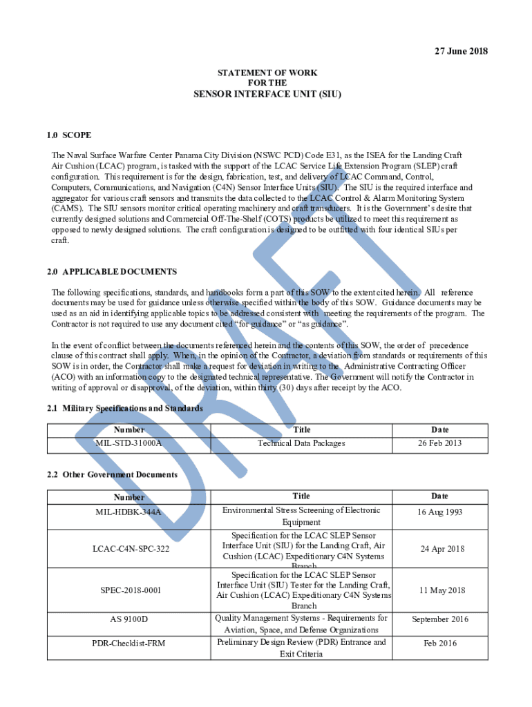 27 June 2018 STATEMENT OF WORK FOR SENSOR INTERFACE UNIT (SIX)1.0 SCOPE The Naval Surface Warfare Center Panama City Division (NSW PCD) Code E31, as the IDEA for the Landing Craft Air Cushion (CAC)