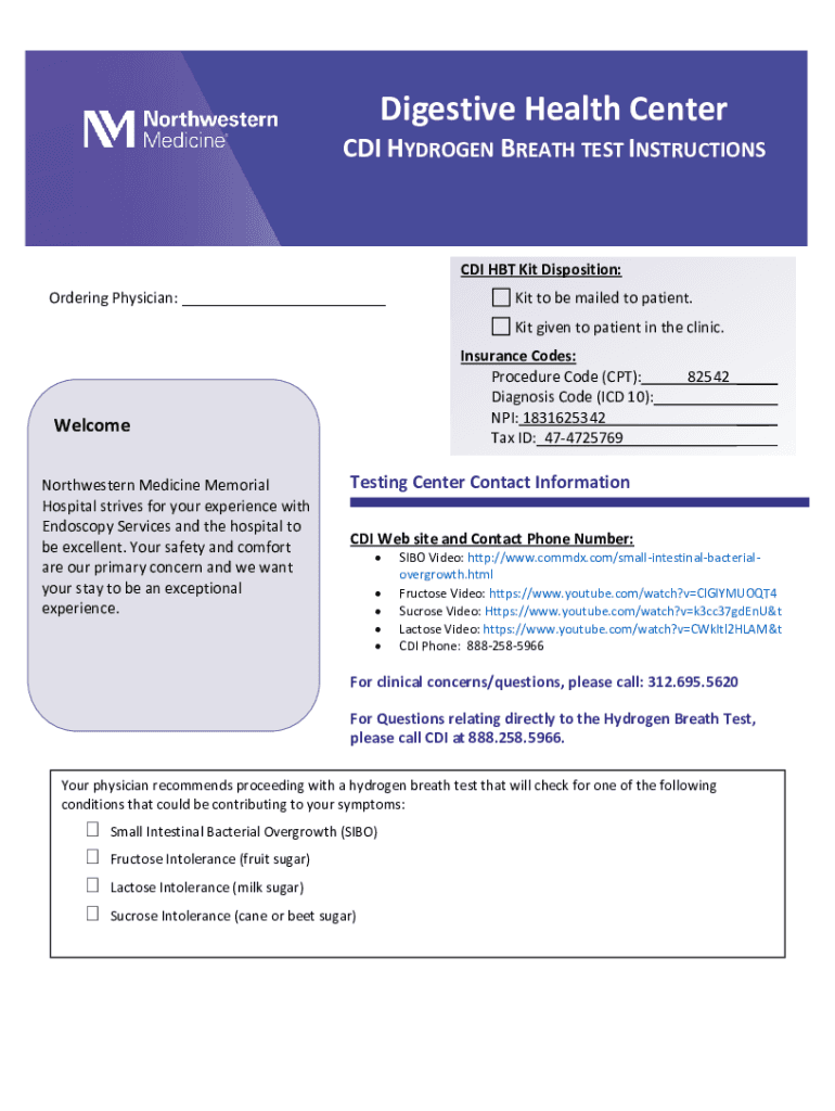 Digestive Health Center CDI HYDROGEN BREATH TEST INSTRUCTIONS CDI HIT Kit Disposition: Ordering Physician: ___Kit to be mailed to patient. Kit given to patient in the clinic. Insurance Codes: Procedure
