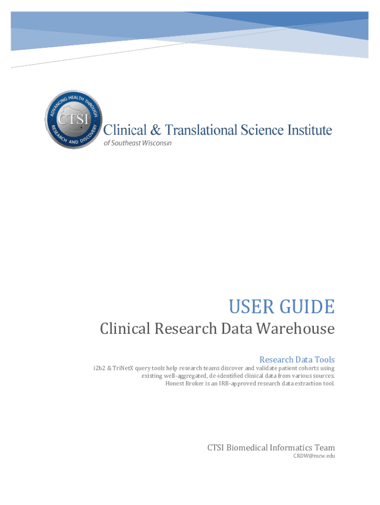 USER GUIDEClinical Research Data WarehouseResearch Data Toolsi2b2 & Trinity query tools help research teams discover and validate patient cohorts using