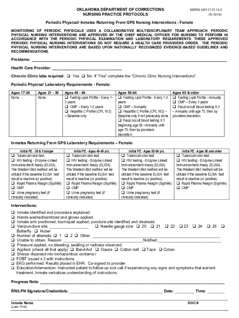 OKLAHOMA DEPARTMENT OF CORRECTIONS NURSING PRACTICE PROTOCOLSMSRM 140117.01.12.5 (R10/19)Periodic Physical/ Inmates Returning From GPS Nursing Interventions Female MONITORING OF PERIODIC PHYSICALS