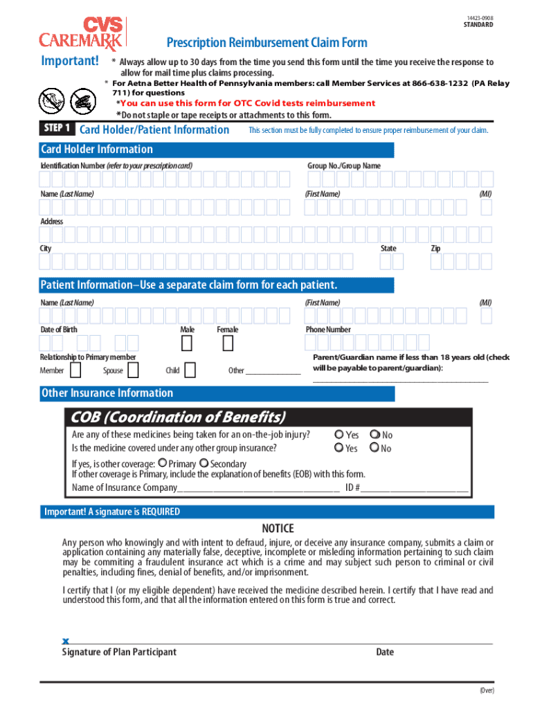 144230908STANDARDPrescription Reimbursement Claim Form Important!* Always allow up to 30 days from the time you send this form until the time you receive the response to allow for mail time plus claims