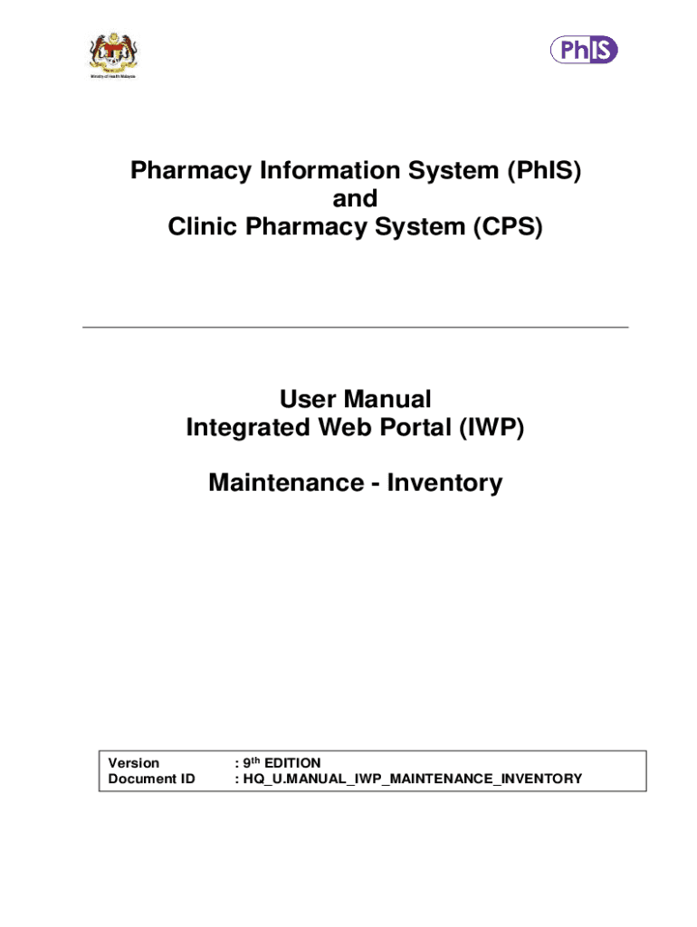 Pharmacy Information System (Phis) and Clinic Pharmacy System (CPS)User Manual Integrated Web Portal (ISP) Maintenance InventoryVersion Document ID: 9th EDITION : HQ_U.MANUAL_IWP_MAINTENANCE_INVENTORYPhIS