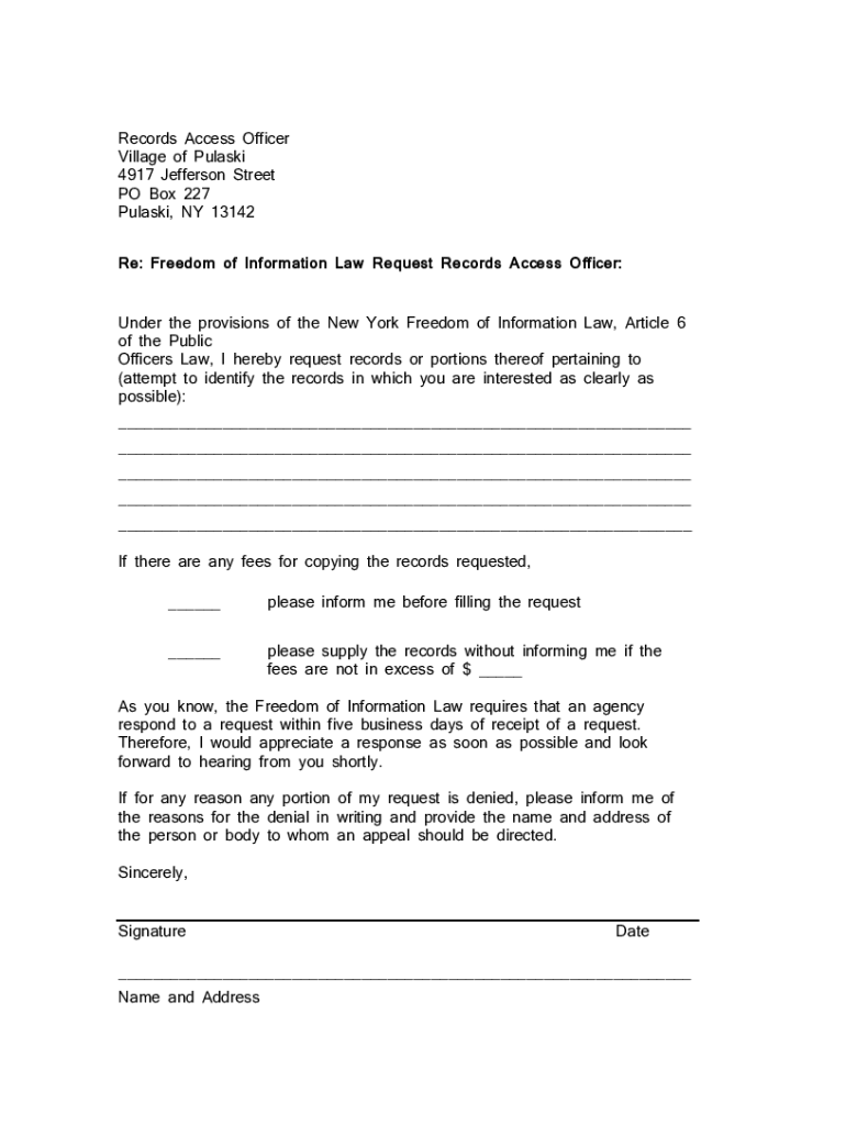 Records Access Officer Village of Pulaski 4917 Jefferson Street PO Box 227 Pulaski, NY 13142 Re: Freedom of Information Law Request Records Access Officer: Under the provisions of the New York Freedom