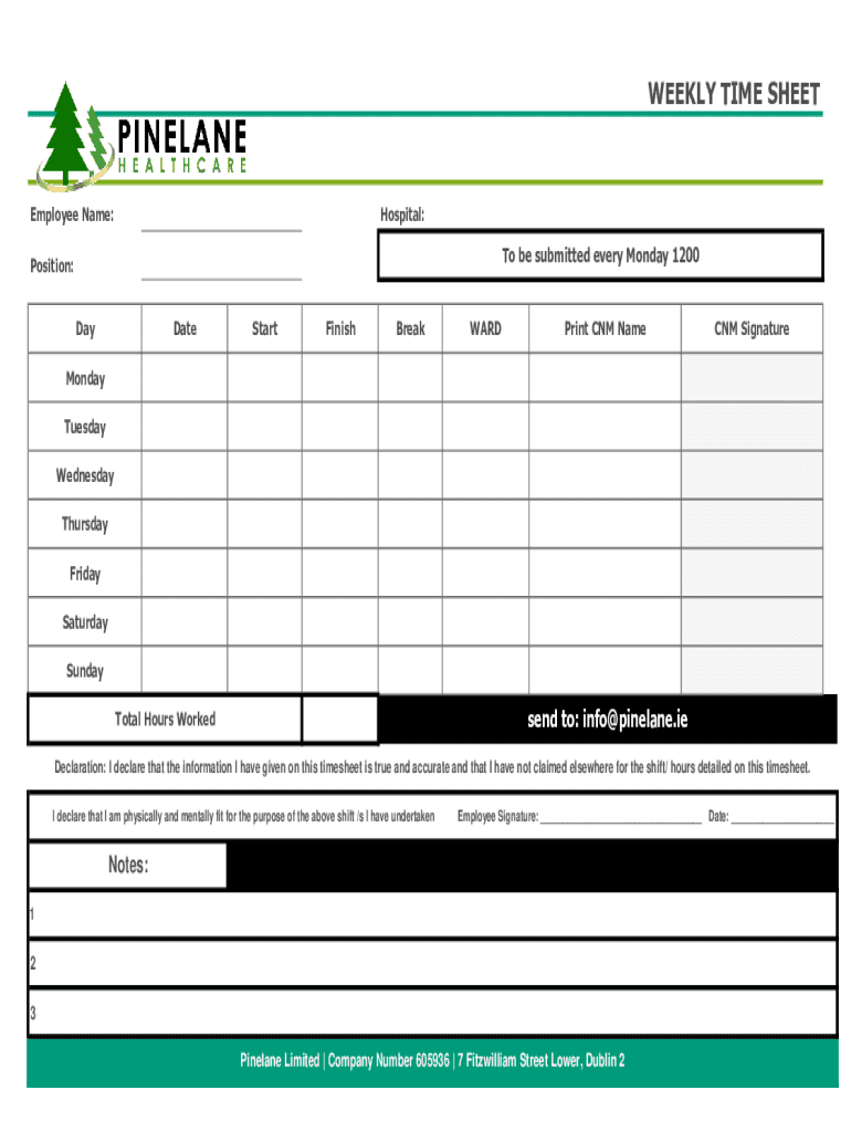 WEEKLY TIME SHEETEmployee Name:Hospital:To be submitted every Monday 1200Position: DayDateStartFinishBreakWARDPrint CNM Name CNM Signature Monday Tuesday Wednesday Thursday Friday Saturday Sunday