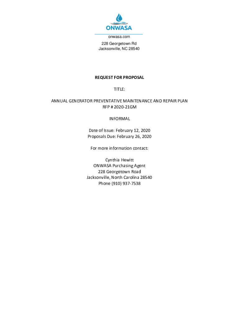 Onwasa.com 228 Georgetown Rd Jacksonville, NC 28540REQUEST FOR PROPOSAL TITLE: ANNUAL GENERATOR PREVENTATIVE MAINTENANCE AND REPAIR PLAN RFP # 202021GM INFORMAL Date of Issue: February 12, 2020, Proposals