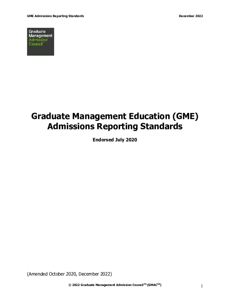 ME Admissions Reporting Standards December 2022Graduate Management Education (ME) Admissions Reporting Standards Endorsed July 2020(Amended October 2020, December 2022) 2022 Graduate Management Admission
