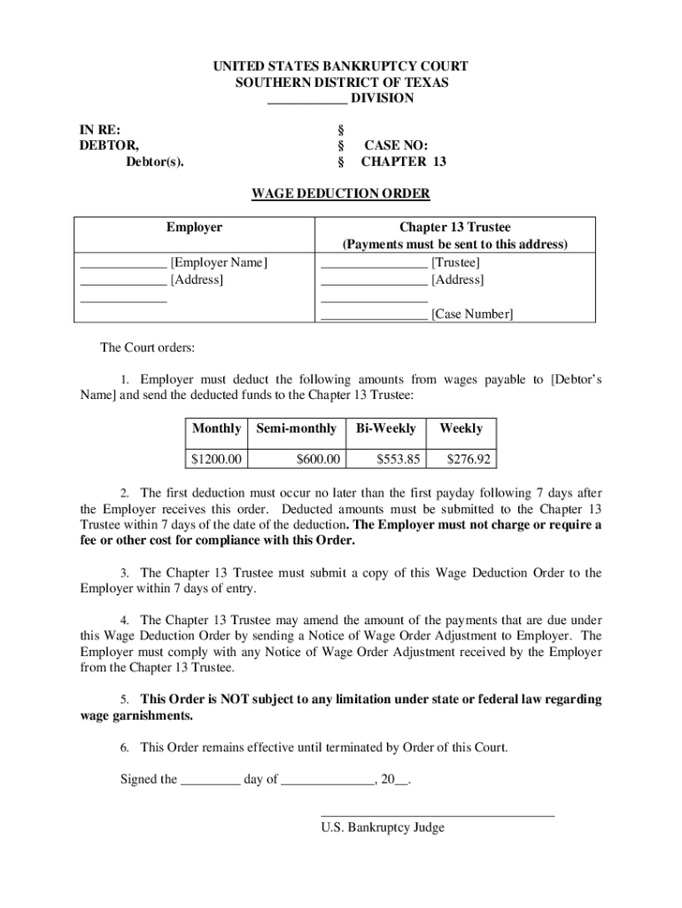 UNITED STATES BANKRUPTCY COURT SOUTHERN DISTRICT OF TEXAS ___ DIVISION IN RE: DEBTOR, Debtor(s). CASE NO: CHAPTER 13WAGE DEDUCTION ORDER Employer ___ [Employer Name] ___ [Address] ___Chapter 13 Trustee