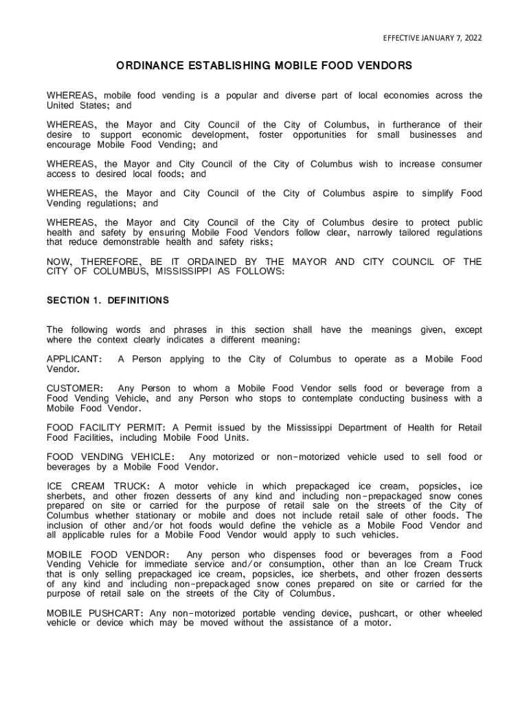 EFFECTIVE JANUARY 7, 2022ORDINANCE ESTABLISHING MOBILE FOOD VENDORS WHEREAS, mobile food vending is a popular and diverse part of local economies across the United States; and WHEREAS, the Mayor and