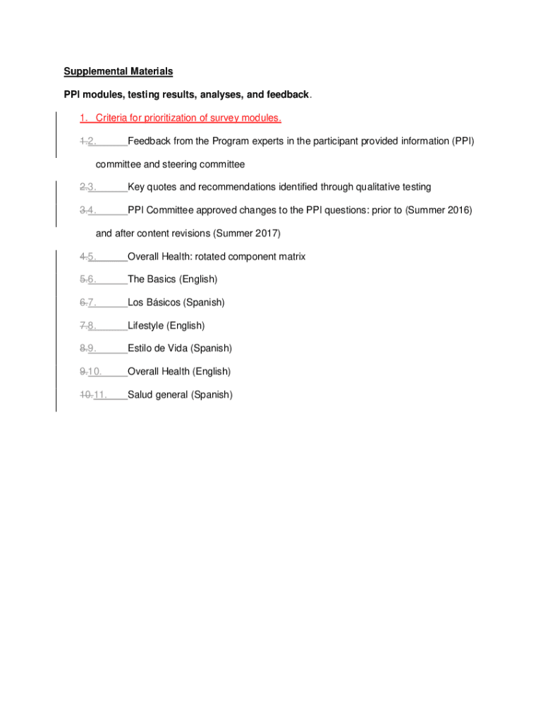 Supplemental Materials PPI modules, testing results, analyses, and feedback. 1. Criteria for prioritization of survey modules. 1.2. Feedback from the Program experts in the participant provided information