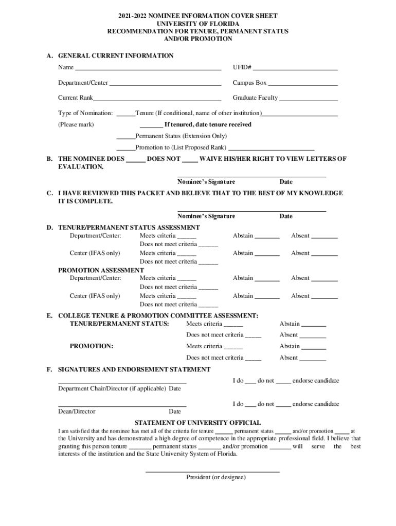 20212022 NOMINEE INFORMATION COVER SHEET UNIVERSITY OF FLORIDA RECOMMENDATION FOR TENURE, PERMANENT STATUS AND/OR PROMOTION A. GENERAL CURRENT INFORMATION Named#Department/CenterCampus Concurrent