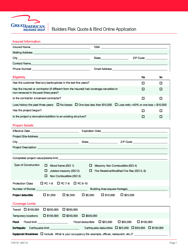 BUILDERS RISK APPLICATIONBuilders Risk Quote & Bind Online Application Insured Information Insured Name___DBA___Mailing Address___ City___State___ZIP Code___Contact Name___ Phone Number___Email Address___EligibilityYesNoHas