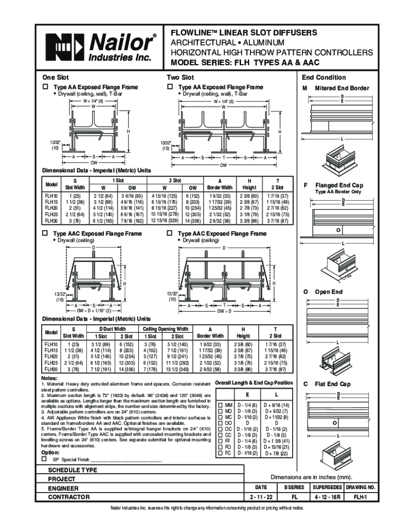 LOWLINESS LINEAR SLOT DIFFUSERS ARCHITECTURAL ALUMINUM HORIZONTAL HIGH THROW PATTERN CONTROLLERS MODEL SERIES: FLH TYPES AA & AAC One Slotted Slated Conditions Type AA Exposed Flange Frame Type AA