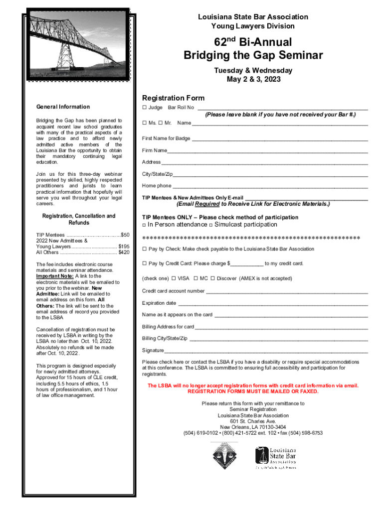 Louisiana State Bar Association Young Lawyers Division62nd Biannual Bridging the Gap Seminar Tuesday & Wednesday, May 2 & 3, 2023General InformationRegistration Form Judge Bar Roll No ___ (Please
