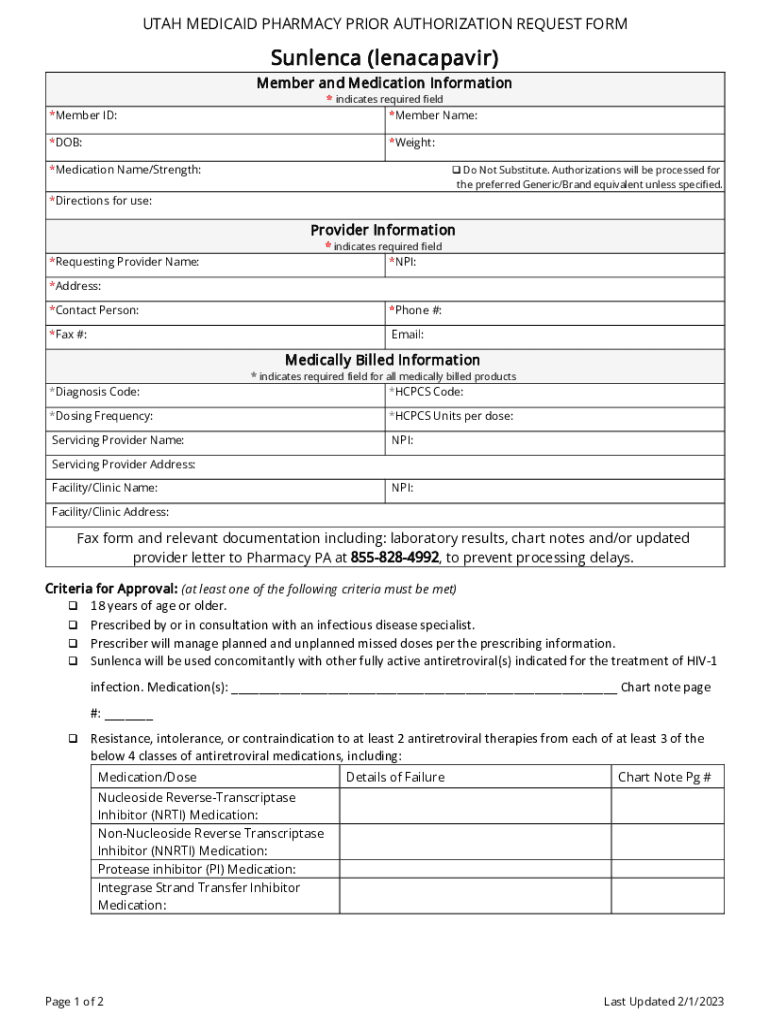 UTAH MEDICAID PHARMACY PRIOR AUTHORIZATION REQUEST FORMSunlenca (lenacapavir) Member and Medication Information * indicates required field×Member ID:*Member Name:*DOB:*Weight:*Medication Name/Strength: