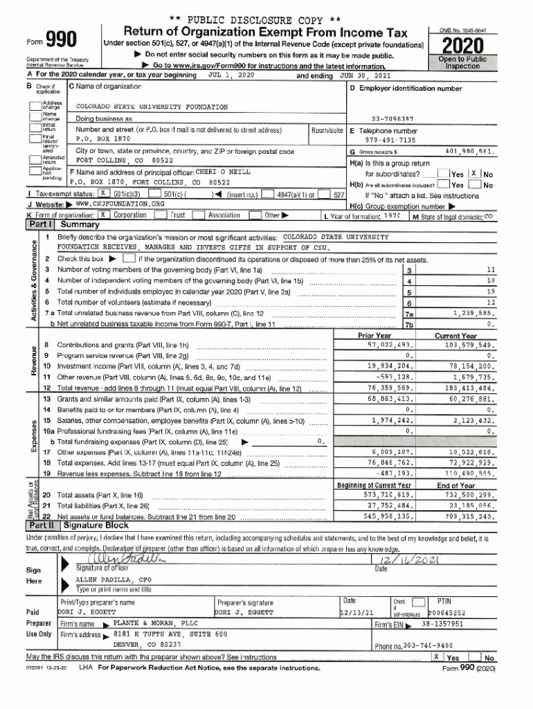 COLORADO STATE UNIVERSITY FOUNDATION Part III Statement of Program Service Accomplishments237098397Form 990 (2020)Check if Schedule O contains a response or note to any line in this Part III 12Briefly