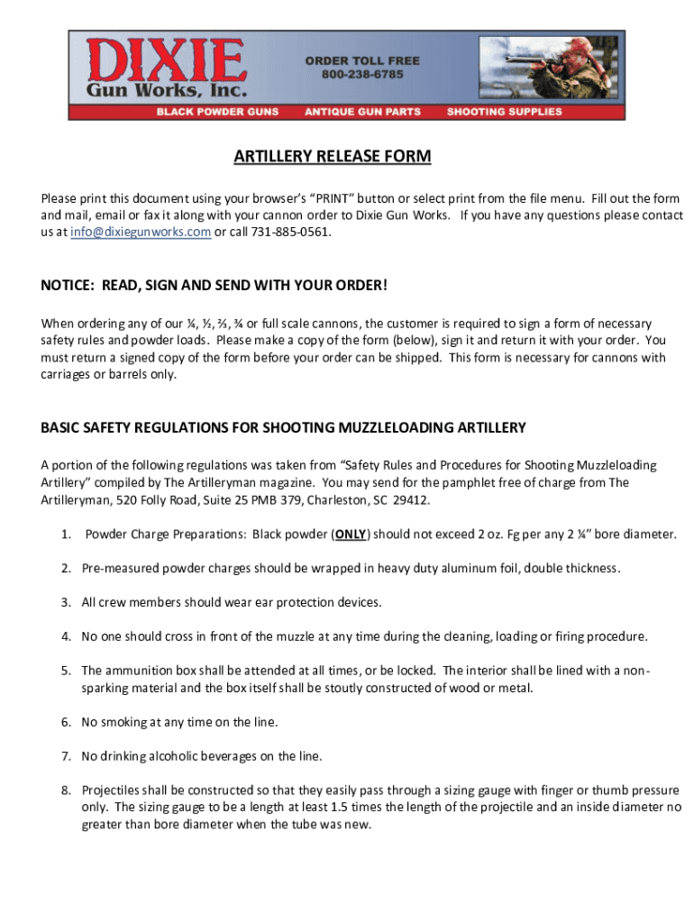 Get the free Artillery Release Form - Dixie Gun Works Fax Email Print