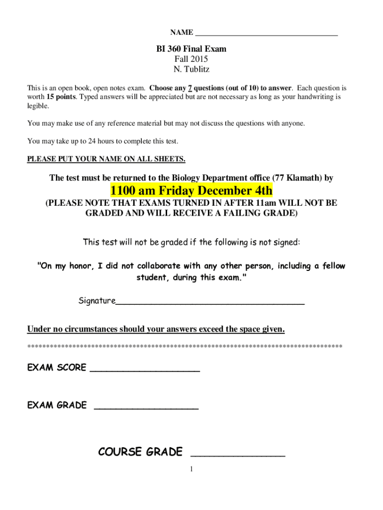 NAME ___BI 360 Final Exam Fall 2015 N. Tu blitz This is an open book, open notes exam. Choose any 7 questions (out of 10) to answer. Each question is worth 15 points. Typed answers will be appreciated