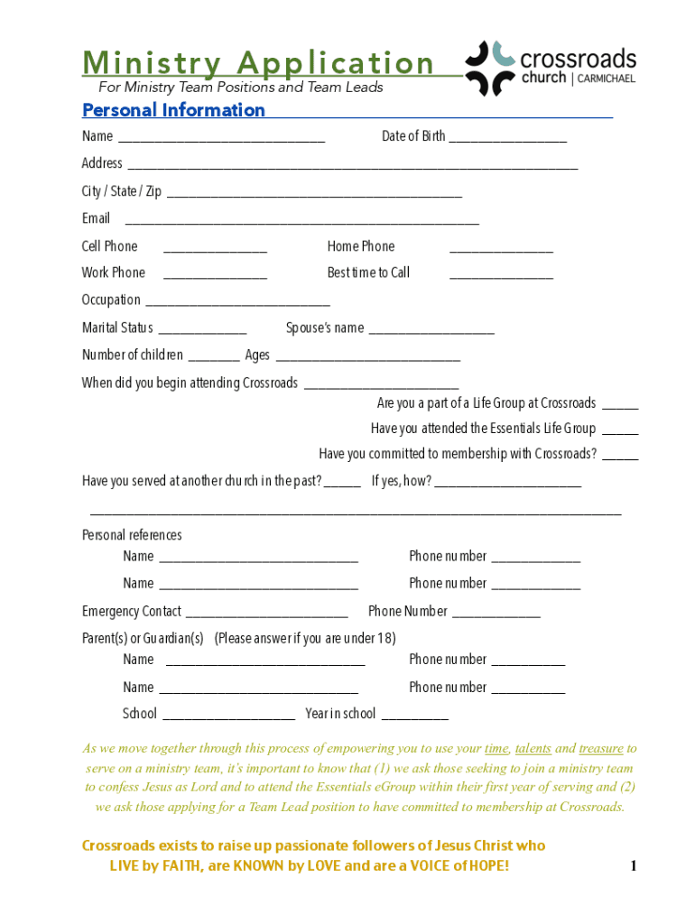 Ministry Application For Ministry Team Positions and Team LeadsPersonal Information Name ___Date of Birth ___Address ___ City / State / Zip ___ Email ___ Cell Phone___Home Phone___Work Phone___Best
