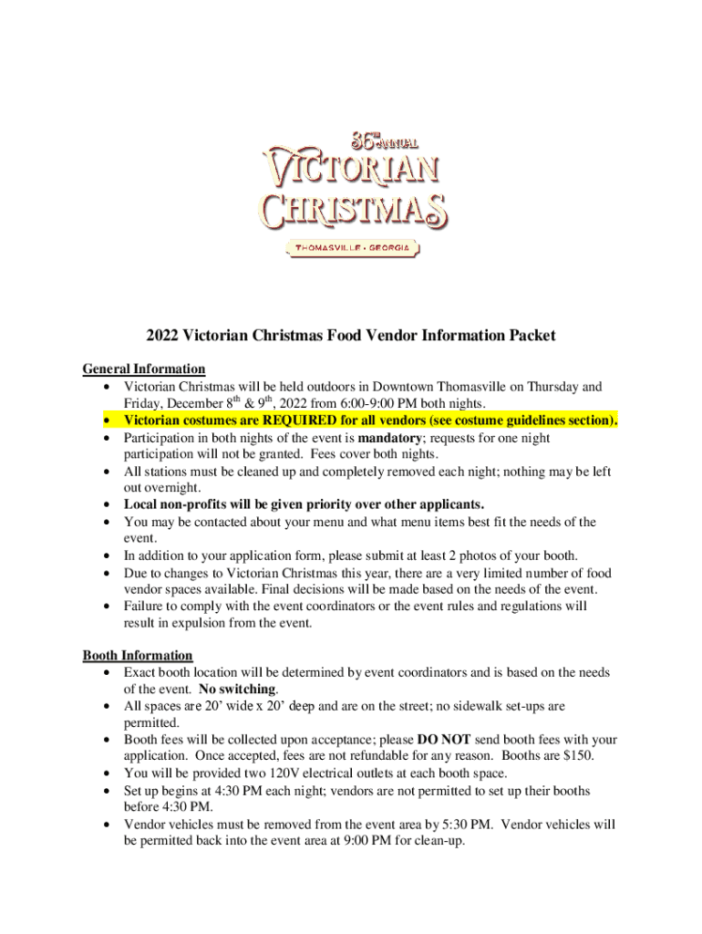 2022 Victorian Christmas Food Vendor Information Packet General Information Victorian Christmas will be held outdoors in Downtown Thomasville on Thursday and Friday, December 8th & 9th, 2022 from