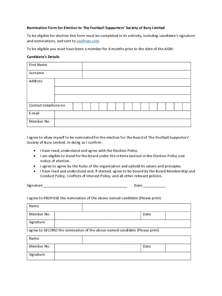 Nomination Form for Election to The Football Supporters Society of Bury Limited To be eligible for election this form must be completed in its entirety, including candidates signature and nominations,