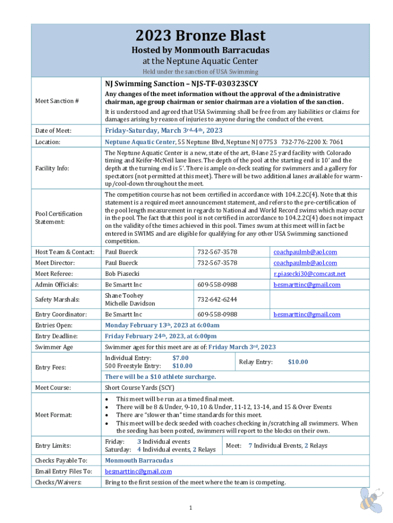 2023 Bronze BlastHosted by Monmouth Barracuda sat the Neptune Aquatic Center Held under the sanction of the USA Swimming NJ Swimming Sanction NJSTF030323SCYMeet Sanction #Any changes of the meet information
