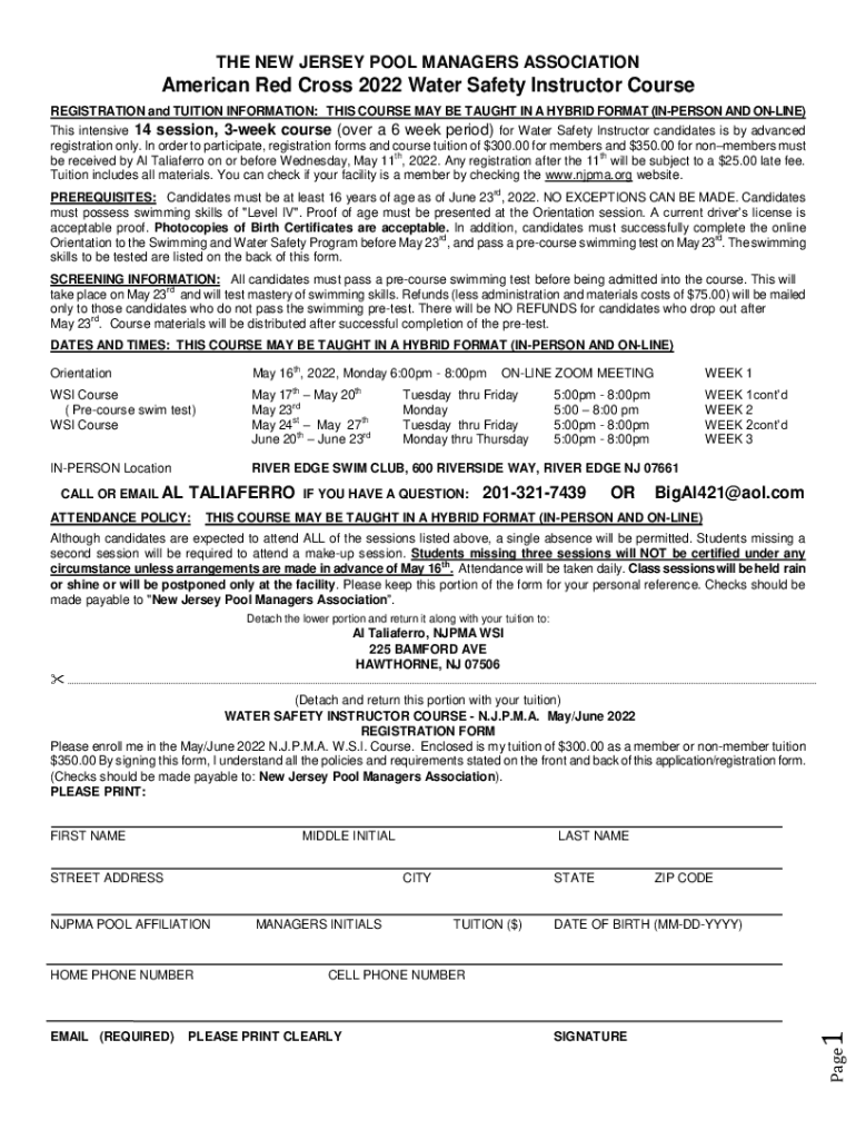 THE NEW JERSEY POOL MANAGERS ASSOCIATION American Red Cross 2022 Water Safety Instructor Course REGISTRATION and TUITION INFORMATION: THIS COURSE MAY BE TAUGHT IN A HYBRID FORMAT (UNPERSON AND ONLINE)