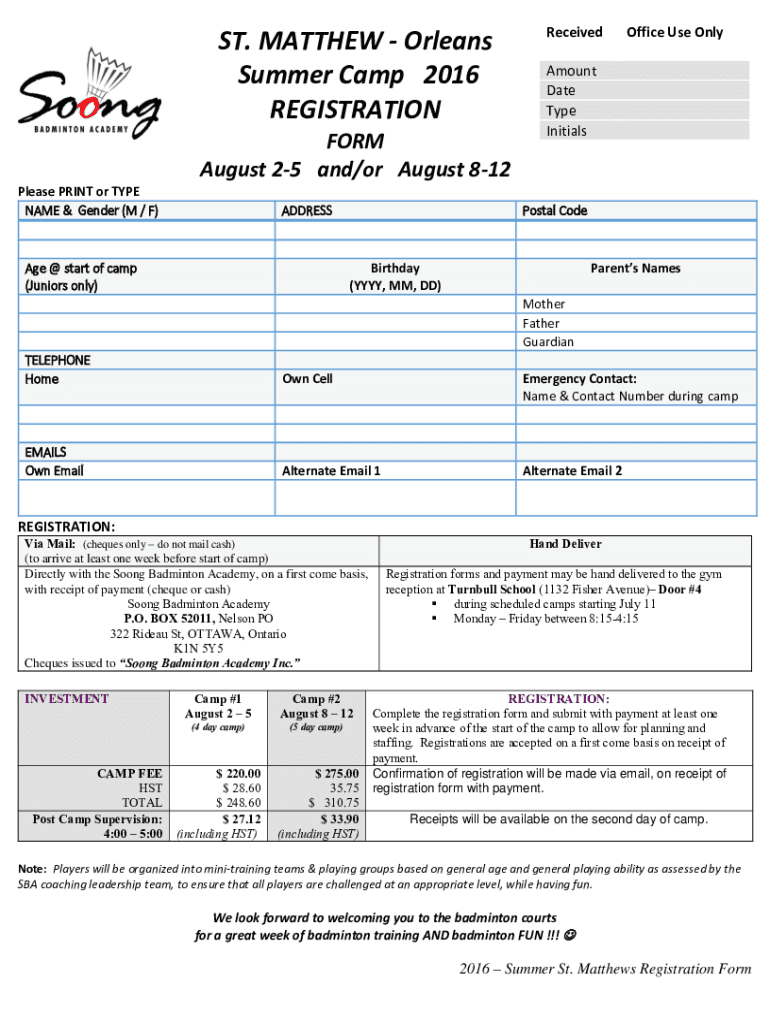 ST. MATTHEW Orleans Summer Camp 2016 REGISTRATION FORM August 25 and/or August 812 Please PRINT or TYPE NAME & Gender (M / F)Dressage @ start of camp (Juniors only)ReceivedOffice Use OnlyAmount Date