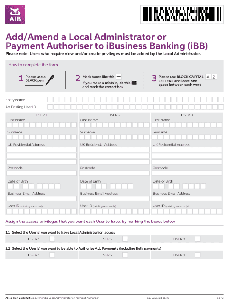 Add/Amend a Local Administrator or Payment Authorizer to business Banking (IBB) Please note: Users who require view and/or create privileges must be added by the Local Administrator. How to complete