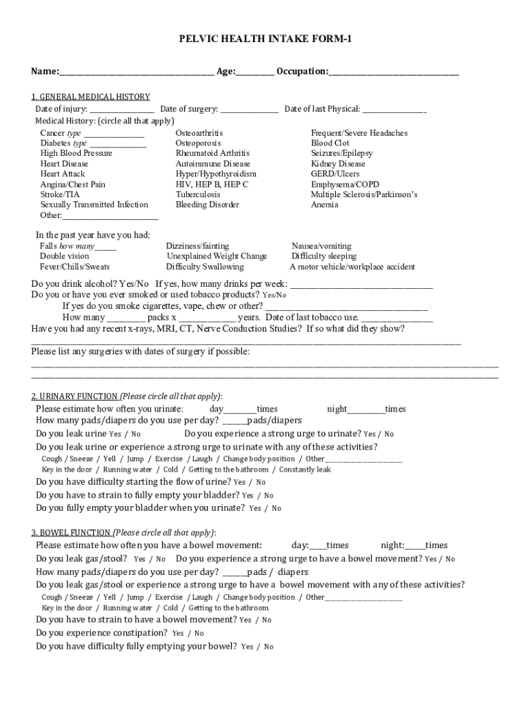 PELVIC HEALTH INTAKE FORM1 Name:___ Age:___ Occupation:___ 1. GENERAL MEDICAL HISTORY Date of injury: ___ Date of surgery: ___ Date of last Physical: ___ Medical History: (circle all that apply) Cancer