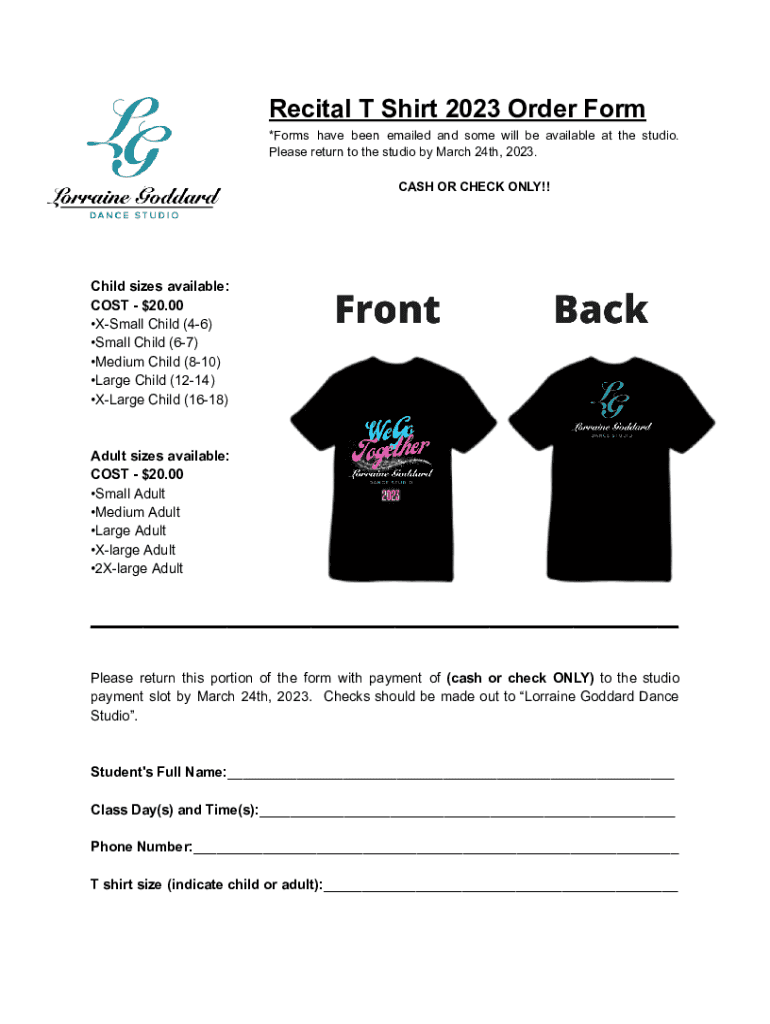 Recital T-Shirt 2023 Order Form *Forms have been emailed and some will be available at the studio. Please return to the studio by March 24th, 2023. CASH OR CHECK ONLY!! Child sizes available: COST