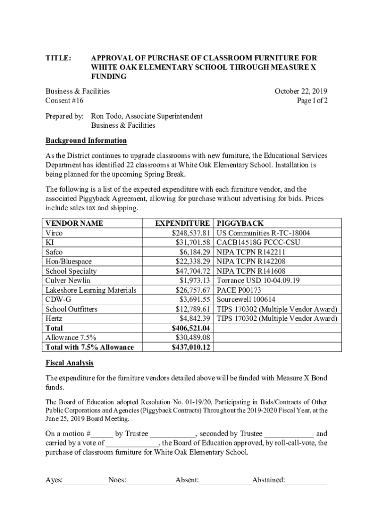 TITLE:APPROVAL OF PURCHASE OF CLASSROOM FURNITURE FOR WHITE OAK ELEMENTARY SCHOOL THROUGH MEASURE X FUNDINGBusiness & Facilities Consent #16October 22, 2019-Page 1 of 2Prepared by: Ron To-do, Associate