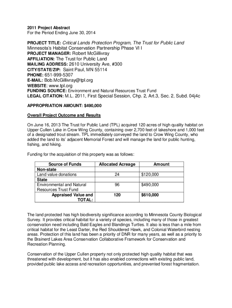 2011 Project Abstract For the Period Ending June 30, 2014, PROJECT TITLE: Critical Lands Protection Program, The Trust for Public Land Minnesota's Habitat Conservation Partnership Phase VI I PROJECT