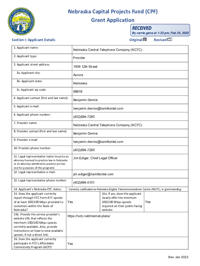Nebraska Capital Projects Fund (CPF) Grant Application By carry. Fans at 1:33 pm, Feb 24, 2023Section I: Applicant DetailsOriginal 1. Applicant name:Nebraska Central Telephone Company (CTC)2. Applicant