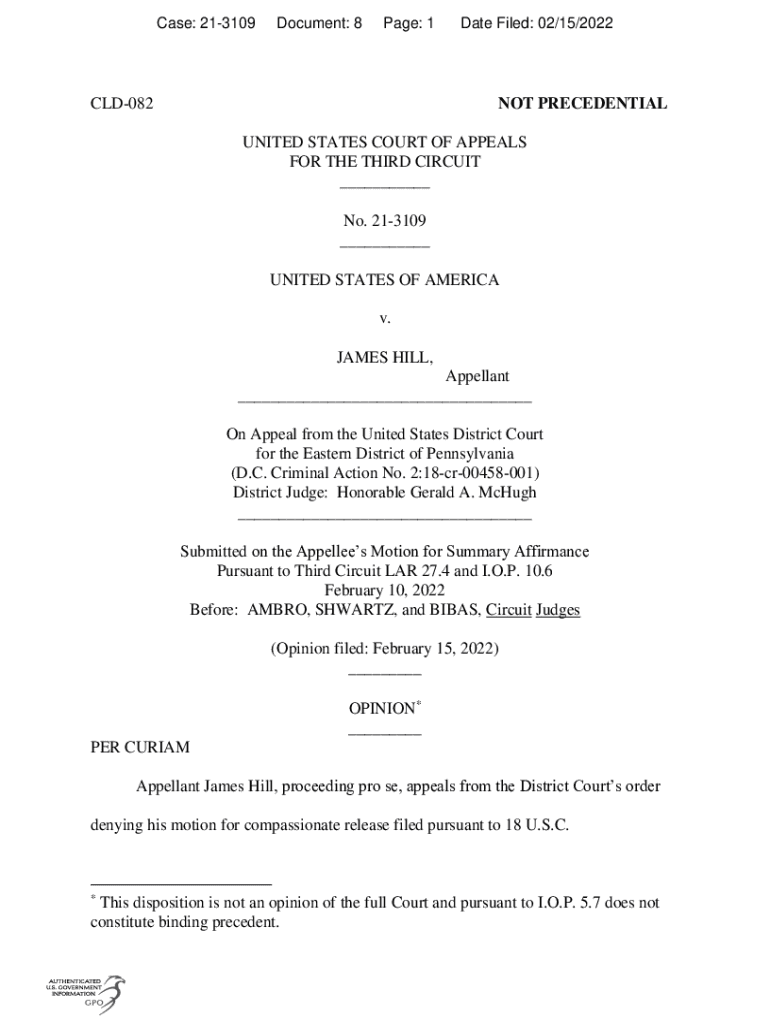 Case: 213109Document: 8Page: 1CLD082Date Filed: 02/15/2022NOT PRESIDENTIAL UNITED STATES COURT OF APPEALS FOR THE THIRD CIRCUIT ___ No. 213109 ___ UNITED STATES OF AMERICA v. JAMES HILL, Appellant
