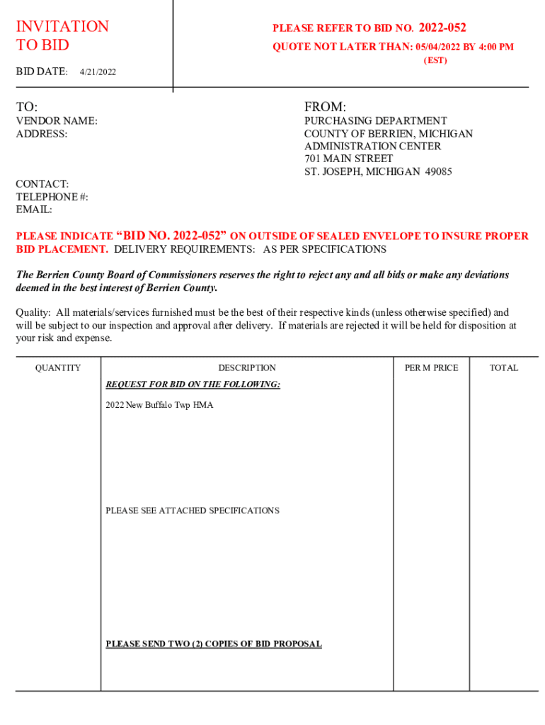 INVITATION TO DISPLEASE REFER TO BID NO. 2022052 QUOTE NOT LATER THAN: 05/04/2022 BY 4:00 PM (EST)BID DATE:4/21/2022TO:FROM:VENDOR NAME: ADDRESS:PURCHASING DEPARTMENT COUNTY OF BERRIES, MICHIGAN ADMINISTRATION