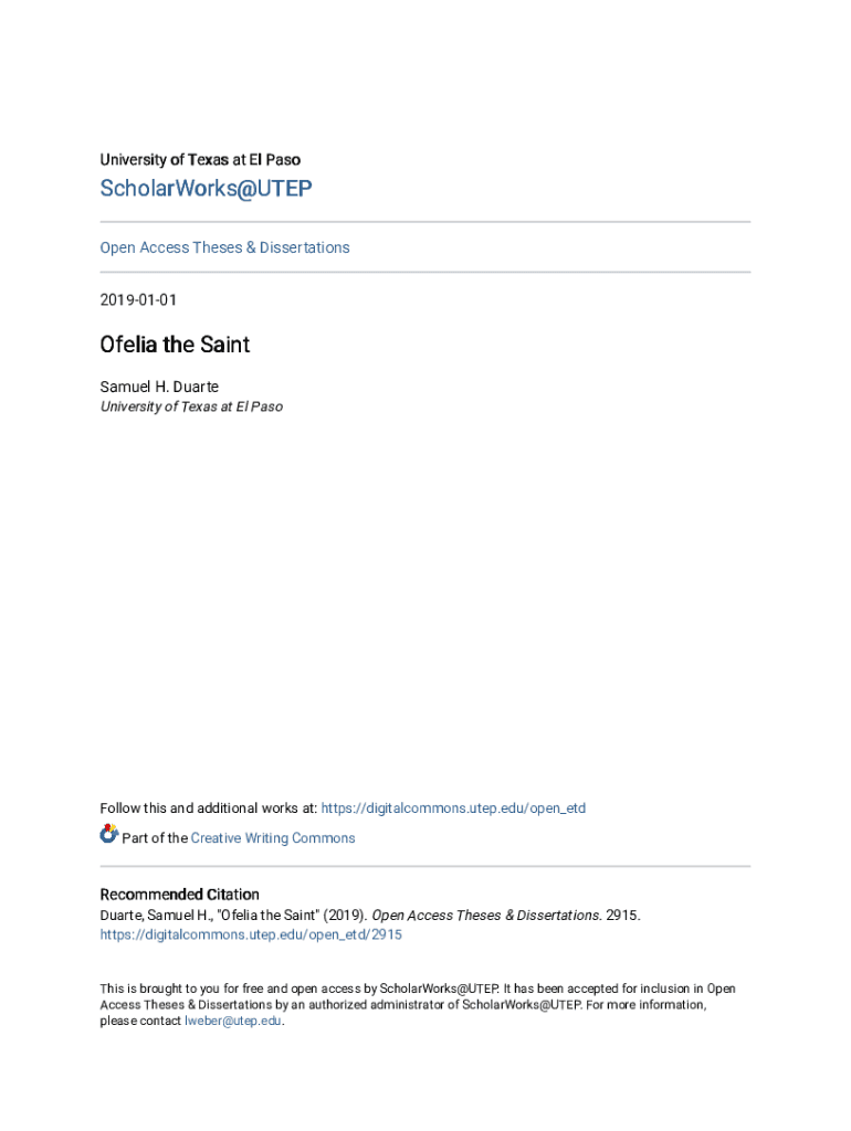University of Texas at El PasoScholarWorks@UTEP Open Access Theses & Dissertations 20190101Ofelia the Saint Samuel H. Duarte University of Texas at El PasoFollow this and additional works at: https://digitalcommons.utep.edu/open_etd