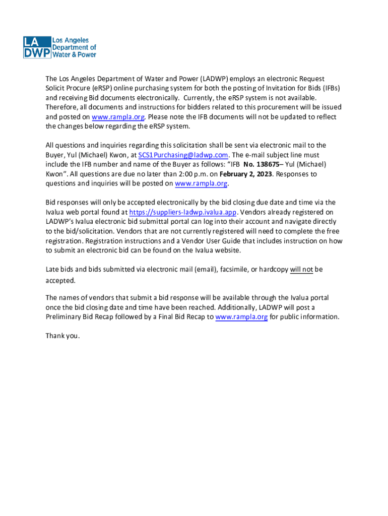 The Los Angeles Department of Water and Power (LAD WP) employs an electronic Request Solicit Procure (ESP) online purchasing system for both the posting of Invitation for Bids (FBS) and receiving